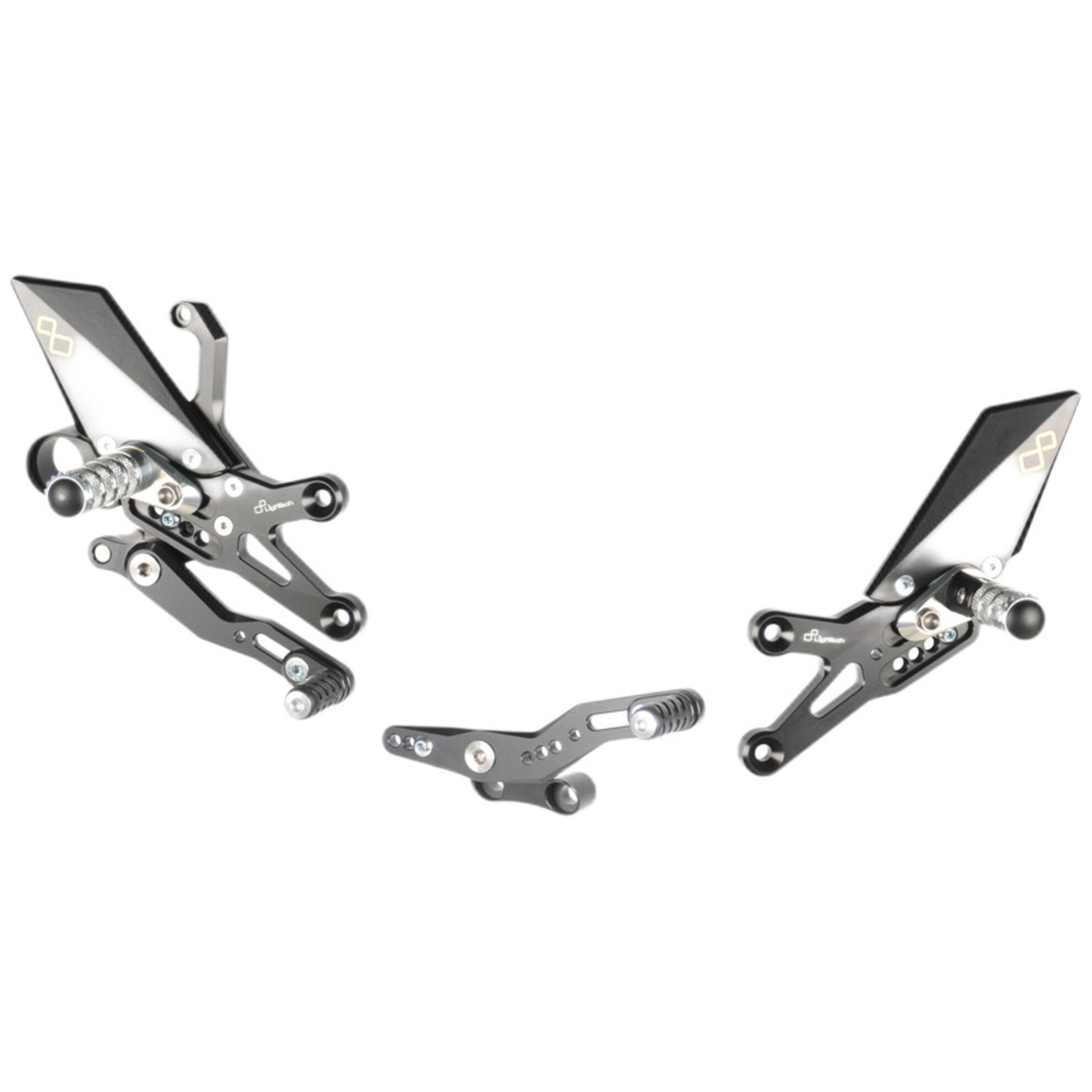 They are adjustable in height and backwards, offering multiple footpeg positions, which can be implemented with the aid of optional footpeg holders. Up to 3 high-quality bearings are integrated into the levers to withstand the most extreme stresses on the road, but especially on the track. The rearsets can be customized thanks to a wide range of accessories and spare parts.