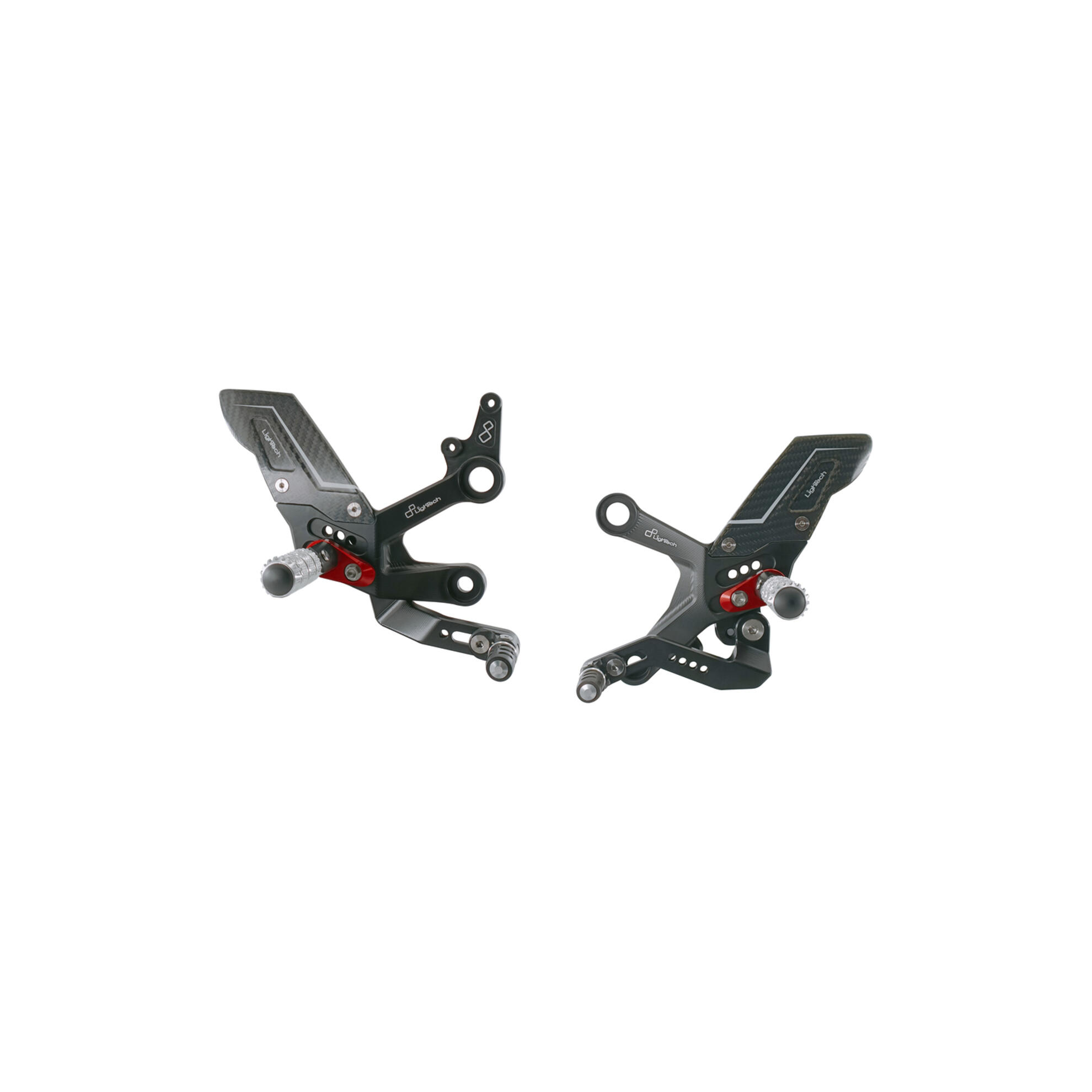 The ""R"" rearset is equipped with folding silver footpegs and toe-pegs, carbon heel guards, titanium bolts and red footpeg supports.