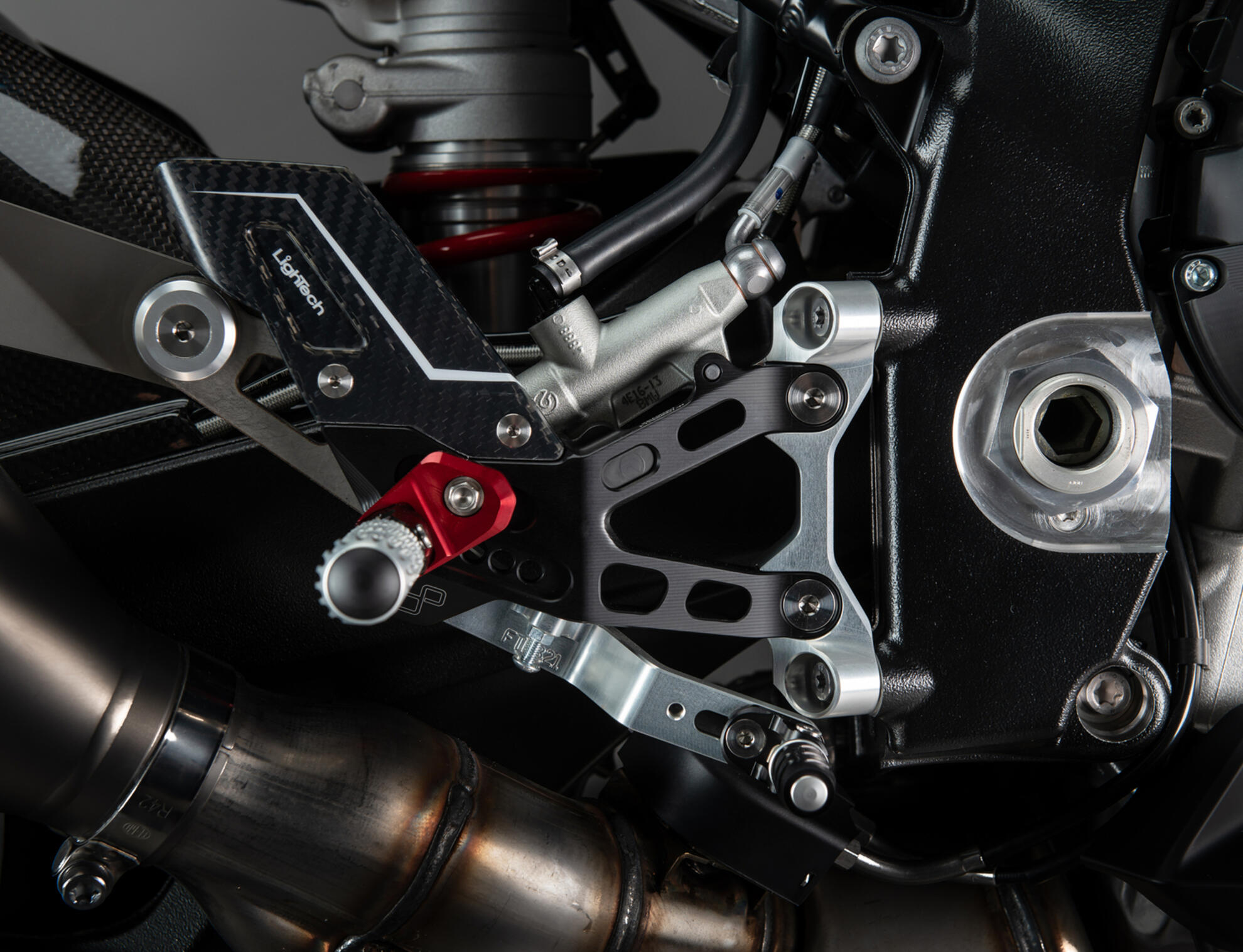 Le pedane Lightech sono realizzate in Ergal 7075-T6 ricavate dal pieno. Il supporto principale è costituito da un unico blocco, ne consegue una struttura più resistente e un'eccezionale rigidità che trasmette al pilota un maggior feeling di guida.