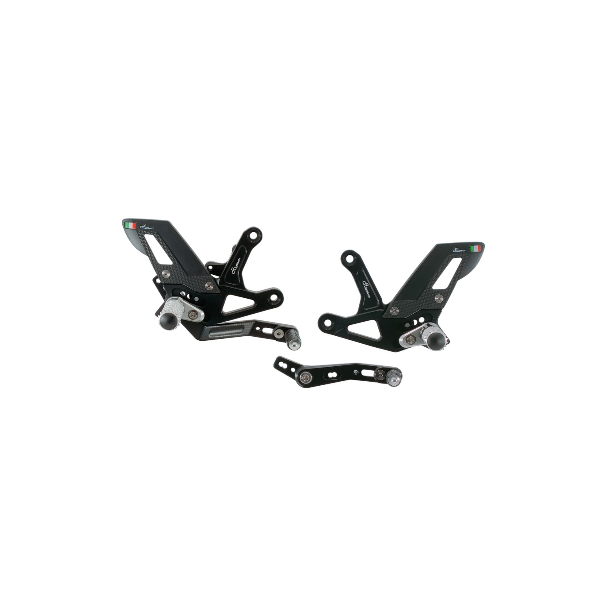 Sono regolabili in altezza e in arretramento offrendo molteplici posizionamenti del poggiapiede, implementabili con ausilio di pastrine supporto poggiapiede opzionali. Nelle leve sono integrati fino a 3 cuscinetti di alta qualità per poter sopportare le sollecitazioni più estreme su strada, ma soprattutto su pista. Le pedane possono essere personalizzate grazie ad una vasta gamma di accessori e ricambi.