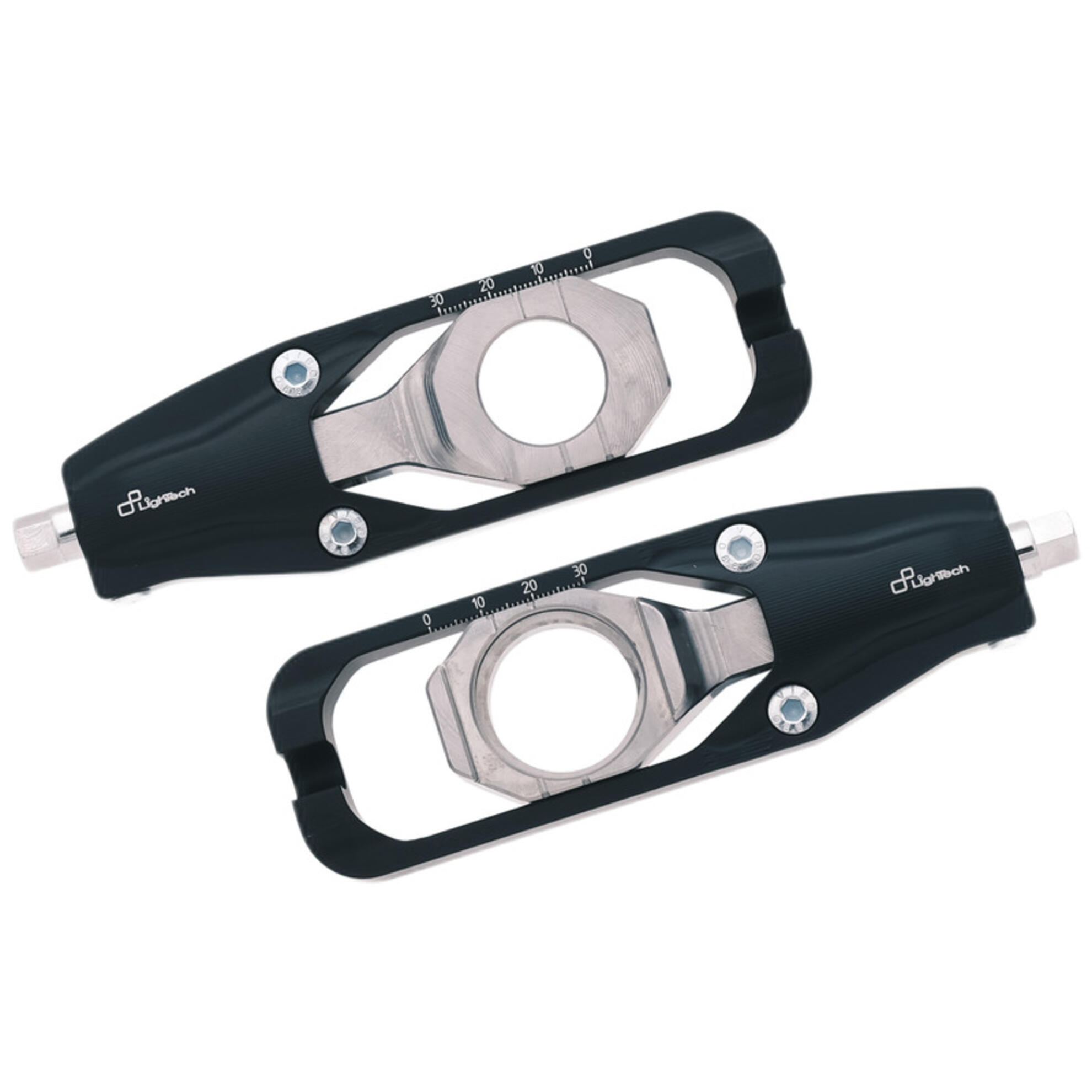 I nostri tendicatena sono realizzati in Ergal 7075 ricavati dal pieno, al fine di garantire una maggiore resistenza. Forniscono una regolazione della catena più accurata e facile rispetto ai tendicatena di serie. Presentano una regolazione esterna a vite per una messa a punto più veloce e precisa. Sul tendicatena è incisa una scala graduata a laser che ne facilita la regolazione. E' disponibile come opzionale il kit di forchette codice FTEHO004. Per questo modello sono stati impiegati gli occhielli in acciaio per resistere alle maggiori sollecitazioni.