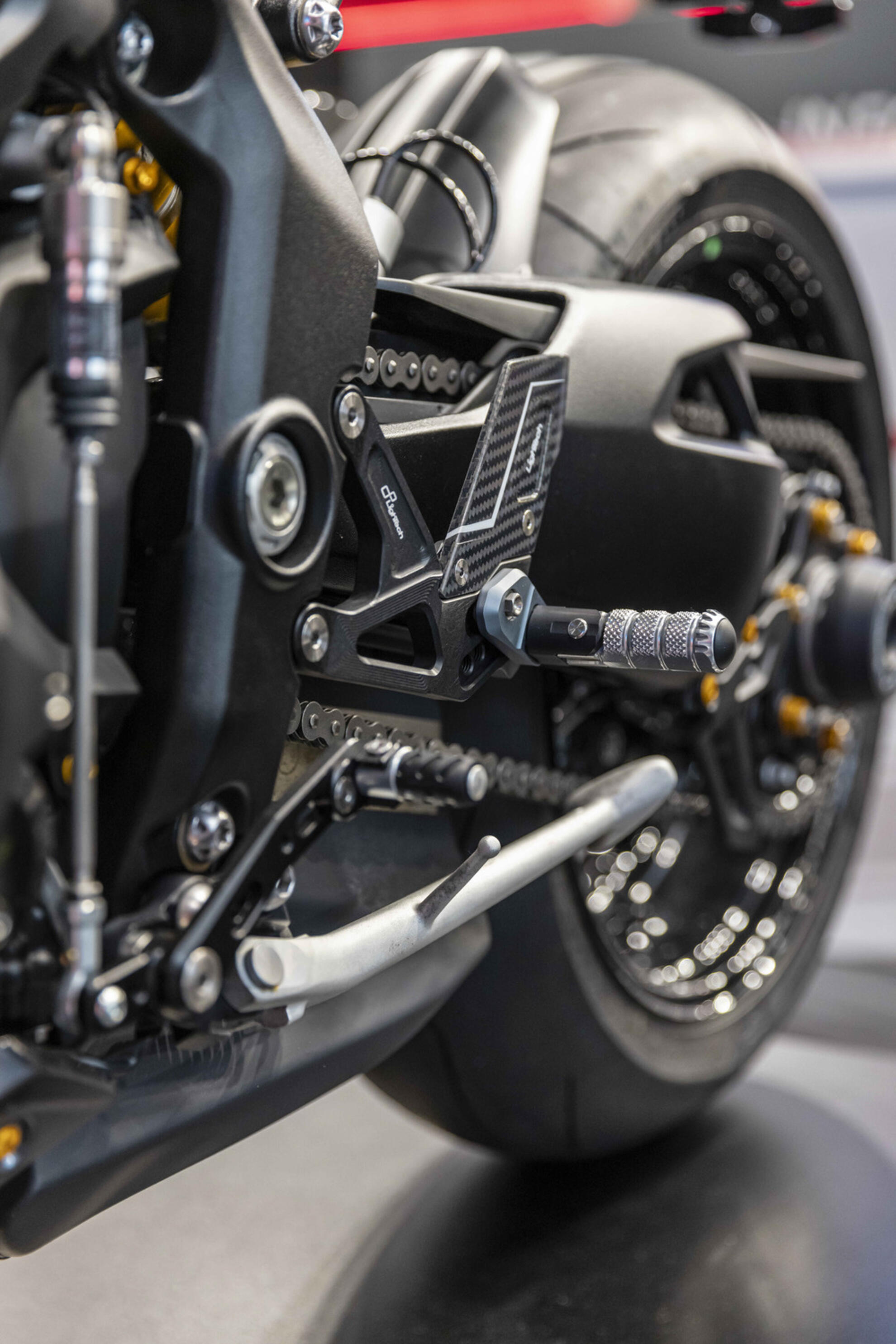 La versione “R” si distingue per una dotazione tecnica e racing di alto livello: poggiapiedi pieghevoli silvercon supporto rosso, puntalini pieghevoli, paratacchi in carbonio, viteria in titanio, realizzati con materiali selezionati per garantire leggerezza, resistenza ed esclusività. Ogni singolo componente è disponibile anche separatamente, permettendo una manutenzione semplice e la possibilità di aggiornare la pedana nel tempo.