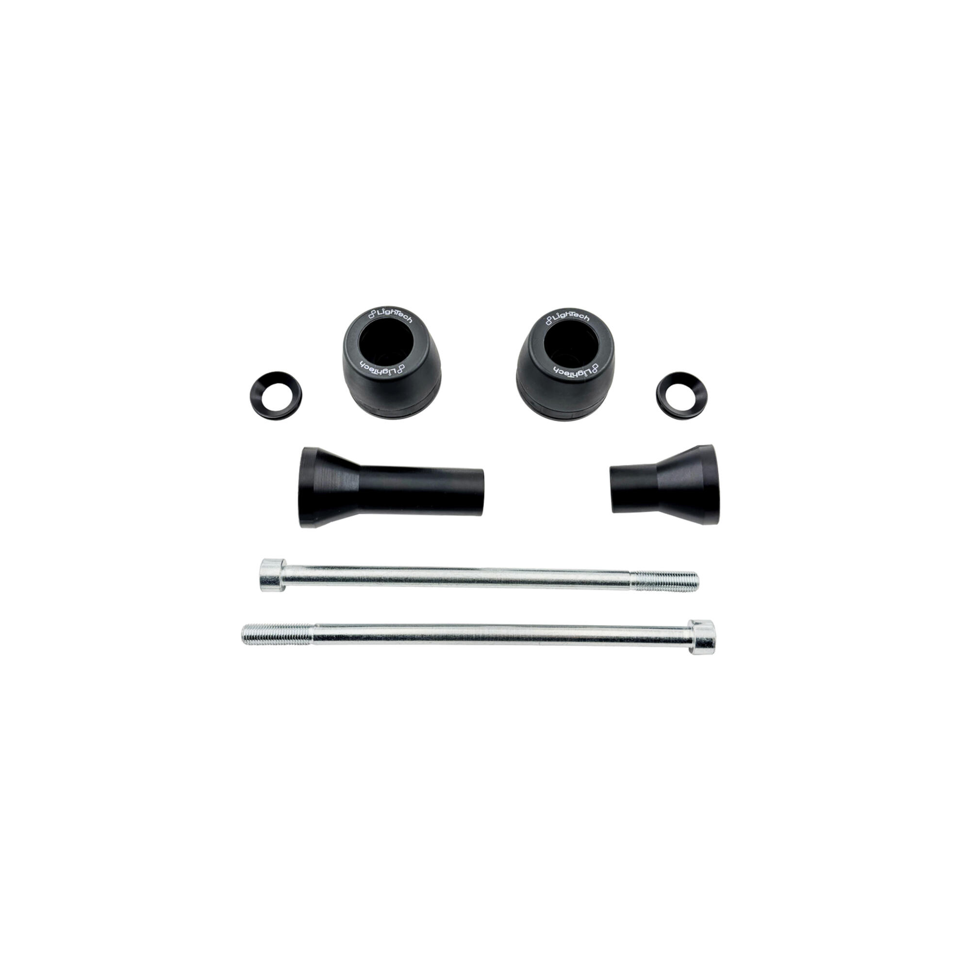 LighTech frame protectors were created with the aim of protecting the fairing, the engine and other parts of the motorbike from possible impacts or damage. Every single component has been studied and developed to increase the protection factor, also thanks to the particular materials used: the upper ring is produced in aluminium, a very resistant material but, at the same time, very light; the oscillation bush is made of magnesium, the shell silk-screened with the Lightech logo laser-branded in nylon; the shock-absorber rubber in TPE, hardness 60 Shore and the magnesium bottom. LighTech frame protectors are supplied with everything needed for assembly (including pins and spacers). The standard configuration is supplied with BLACK aluminum rings and BLACK anti-shock rubbers, but it is possible to customize the LighTech frame protectors by purchasing rings and rubbers in other colors separately.