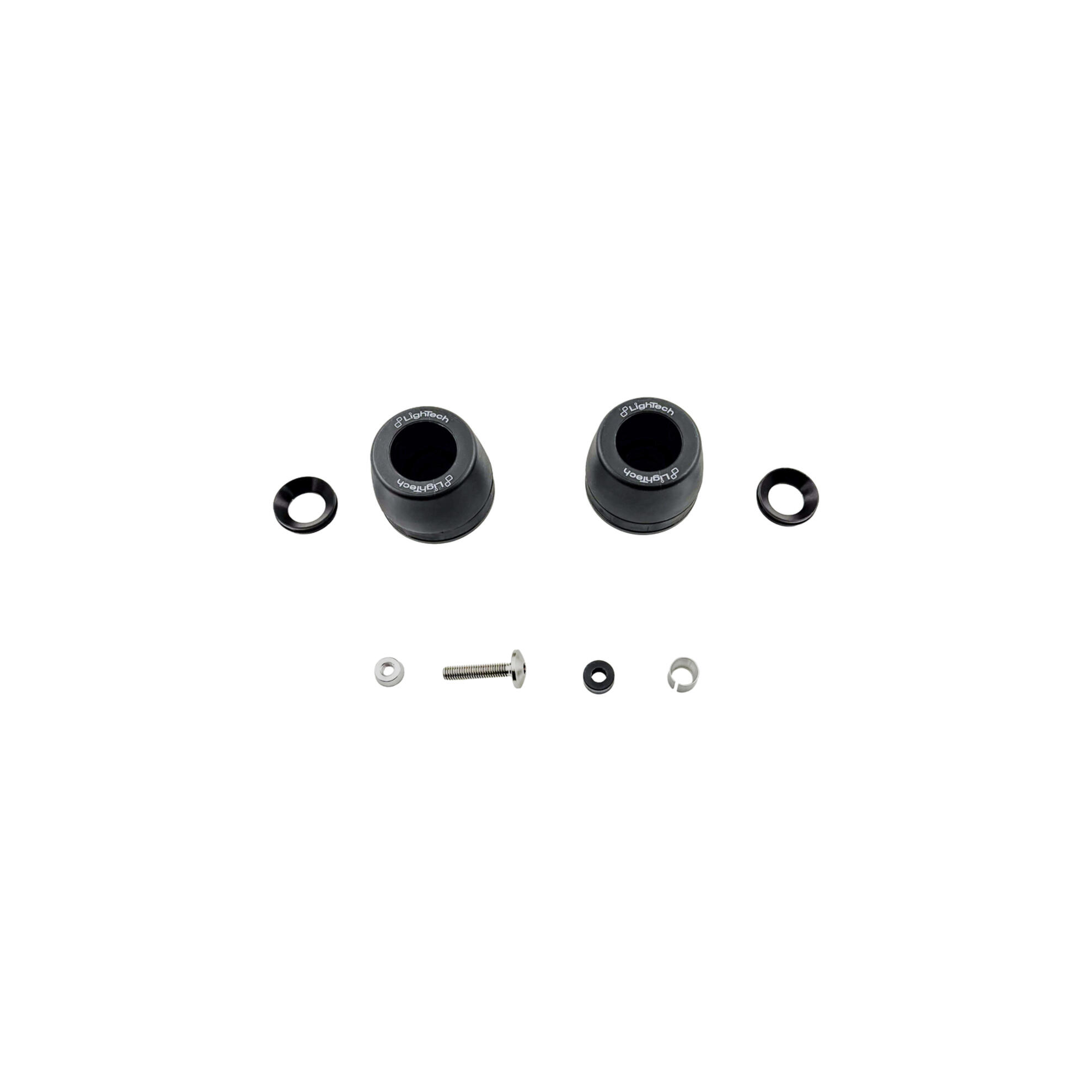 LighTech frame protectors were created with the aim of protecting the fairing, the engine and other parts of the motorbike from possible impacts or damage. Every single component has been studied and developed to increase the protection factor, also thanks to the particular materials used: the upper ring is produced in aluminium, a very resistant material but, at the same time, very light; the oscillation bush is made of magnesium, the shell silk-screened with the Lightech logo laser-branded in nylon; the shock-absorber rubber in TPE, hardness 60 Shore and the magnesium bottom. LighTech frame protectors are supplied with everything needed for assembly (including pins and spacers). The standard configuration is supplied with BLACK aluminum rings and BLACK anti-shock rubbers, but it is possible to customize the LighTech frame protectors by purchasing rings and rubbers in other colors separately.