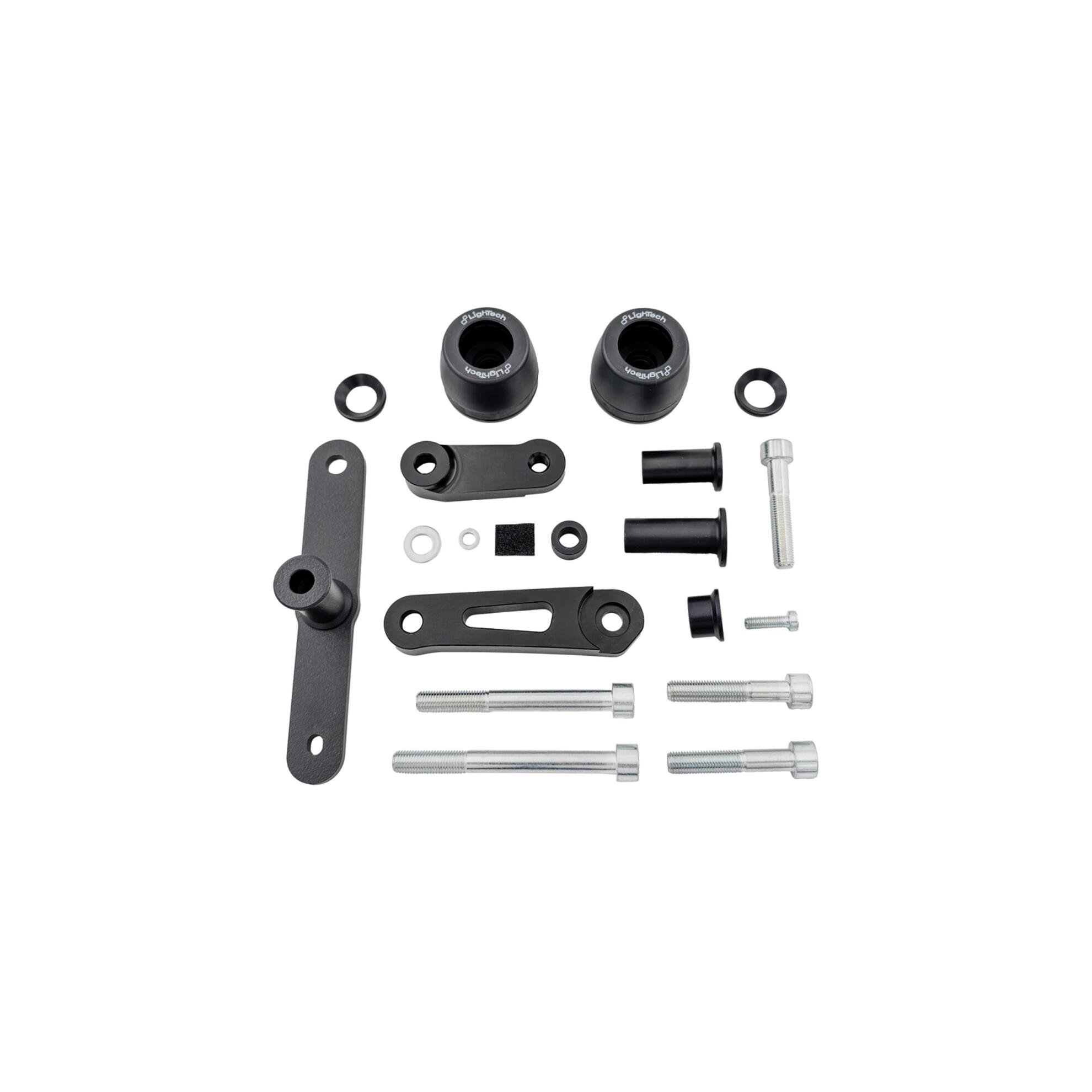 LighTech frame protectors were created with the aim of protecting the fairing, the engine and other parts of the motorbike from possible impacts or damage. Every single component has been studied and developed to increase the protection factor, also thanks to the particular materials used: the upper ring is produced in aluminium, a very resistant material but, at the same time, very light; the oscillation bush is made of magnesium, the shell silk-screened with the Lightech logo laser-branded in nylon; the shock-absorber rubber in TPE, hardness 60 Shore and the magnesium bottom. LighTech frame protectors are supplied with everything needed for assembly (including pins and spacers). The standard configuration is supplied with BLACK aluminum rings and BLACK anti-shock rubbers, but it is possible to customize the LighTech frame protectors by purchasing rings and rubbers in other colors separately.