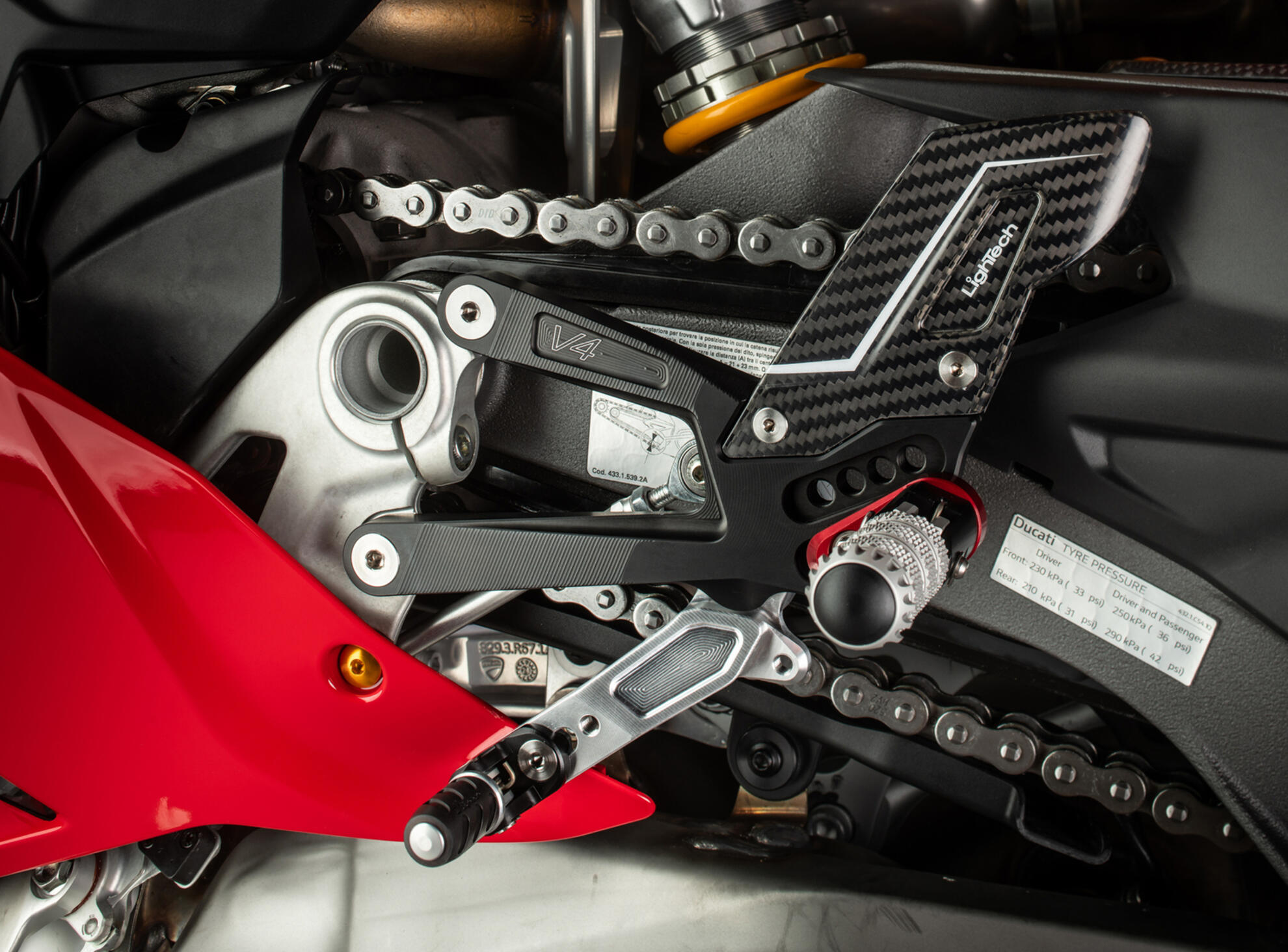 Lightech's rearsets are made of Ergal 7075-T6 machined from solid. The main support is made of a single block, resulting in a more resistant structure and exceptional rigidity that transmits a greater driving feeling to the rider. They are adjustable in height and backwards, offering multiple footpeg positions, which can be implemented with the aid of optional footpeg holders. Up to 3 high-quality bearings are integrated into the levers to withstand the most extreme stresses on the road, but especially on the track. The rearsets can be customized thanks to a wide range of accessories and spare parts. The ""standard"" rearset is equipped with fixed silver footpegs and fixed toe-pegs and silver footpeg supports. If necessary, it is possible to purchase each individual component of the rearset itself. These rearsetes are compatible with the optional UP& DOWN support, code RFTR244.