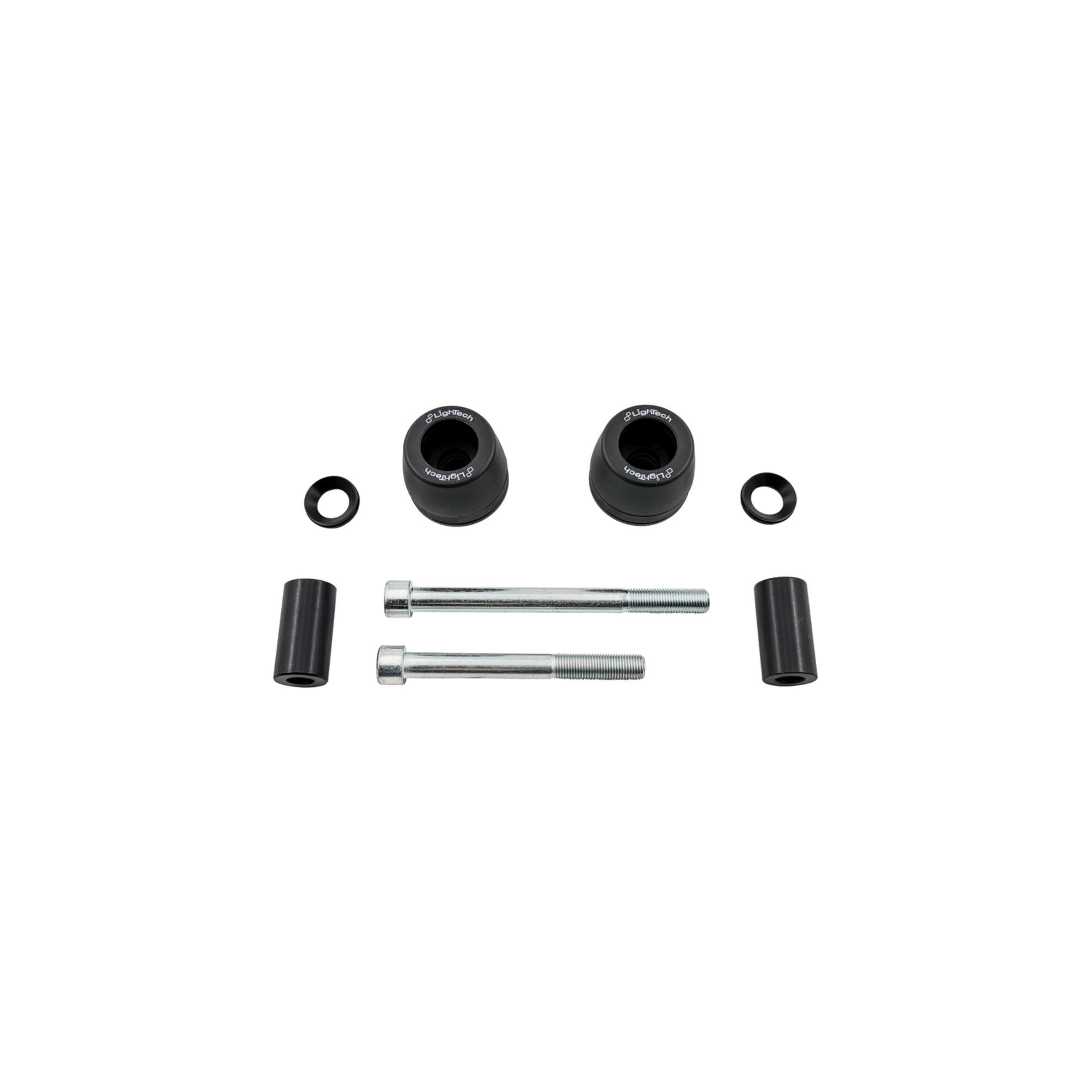 LighTech frame protectors were created with the aim of protecting the fairing, the engine and other parts of the motorbike from possible impacts or damage. Every single component has been studied and developed to increase the protection factor, also thanks to the particular materials used: the upper ring is produced in aluminium, a very resistant material but, at the same time, very light; the oscillation bush is made of magnesium, the shell silk-screened with the Lightech logo laser-branded in nylon; the shock-absorber rubber in TPE, hardness 60 Shore and the magnesium bottom. LighTech frame protectors are supplied with everything needed for assembly (including pins and spacers). The standard configuration is supplied with BLACK aluminum rings and BLACK anti-shock rubbers, but it is possible to customize the LighTech frame protectors by purchasing rings and rubbers in other colors separately.
