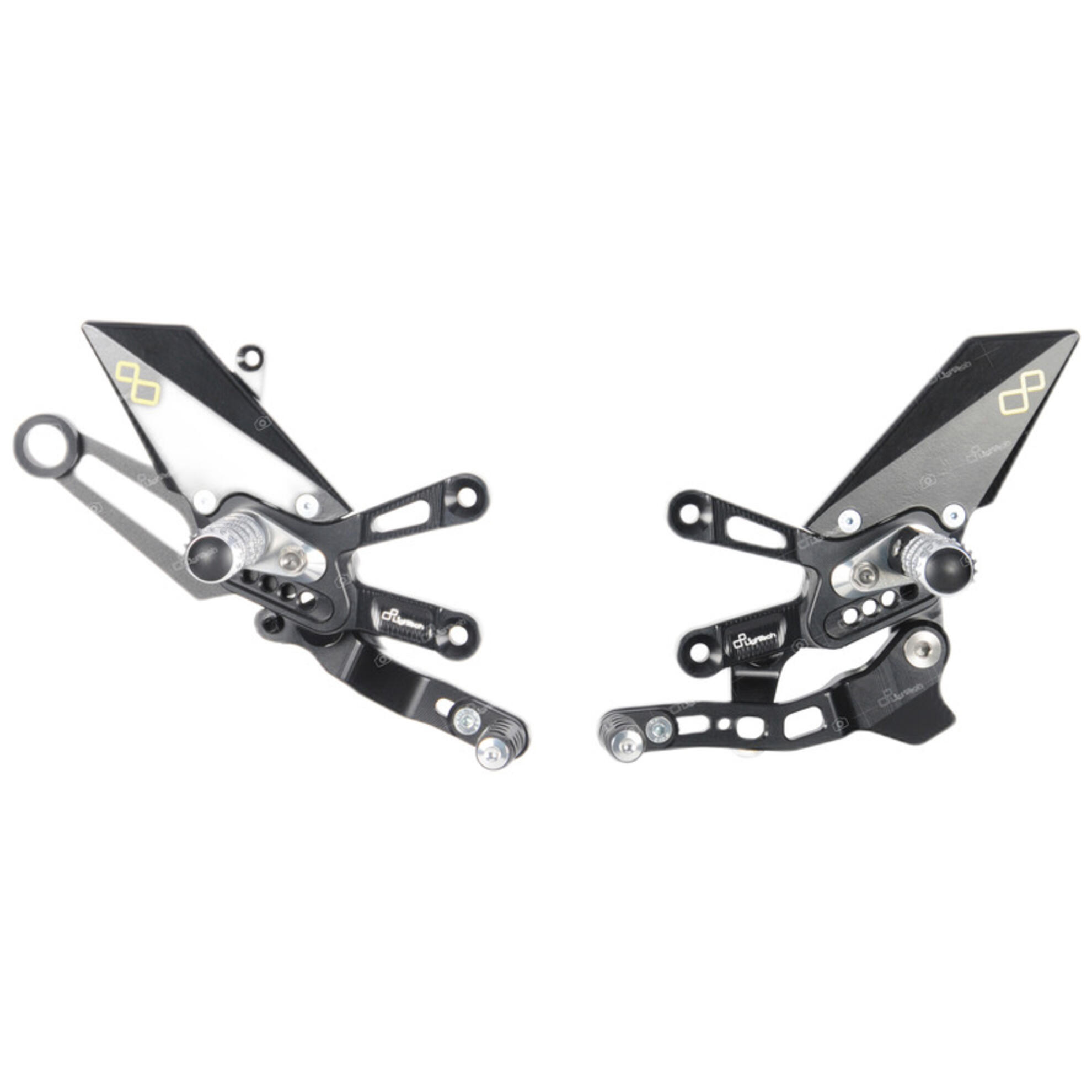 They are adjustable in height and backwards, offering multiple footpeg positions, which can be implemented with the aid of optional footpeg holders. Up to 3 high-quality bearings are integrated into the levers to withstand the most extreme stresses on the road, but especially on the track. The rearsets can be customized thanks to a wide range of accessories and spare parts.