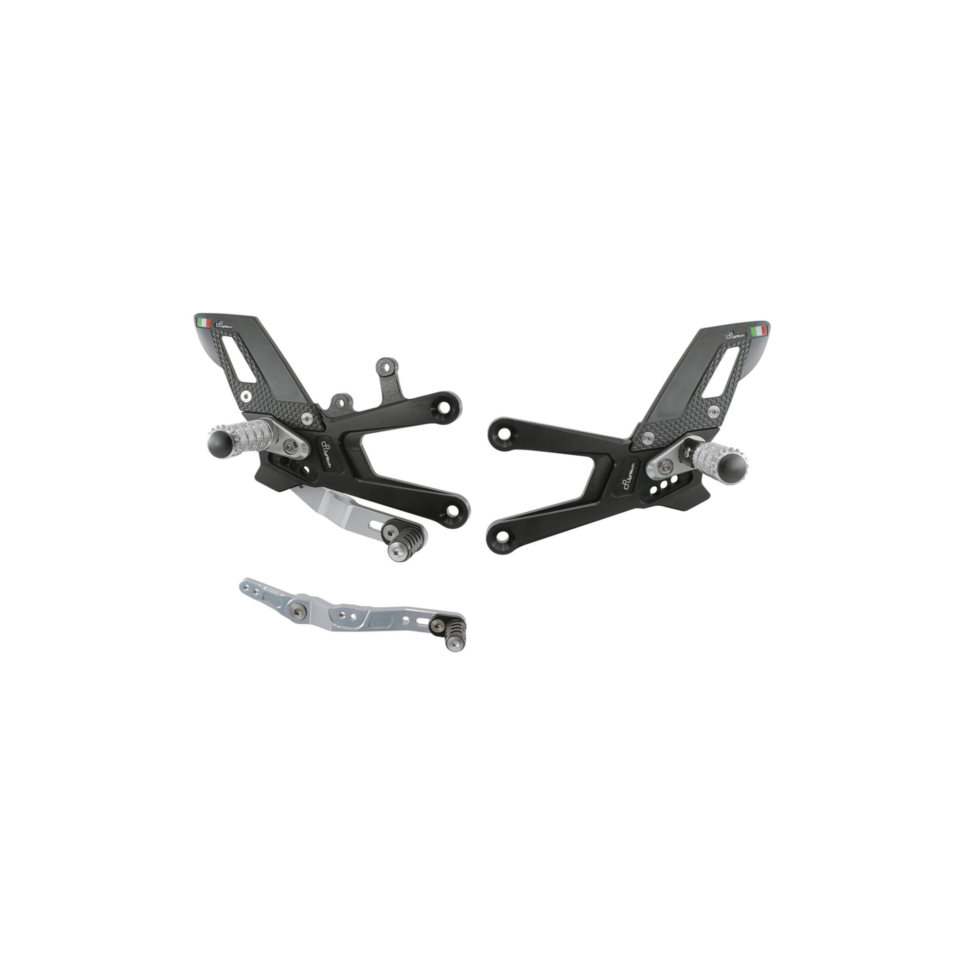 Sono regolabili in altezza e in arretramento offrendo molteplici posizionamenti del poggiapiede, implementabili con ausilio di pastrine supporto poggiapiede opzionali. Nelle leve sono integrati fino a 3 cuscinetti di alta qualità per poter sopportare le sollecitazioni più estreme su strada, ma soprattutto su pista. Le pedane possono essere personalizzate grazie ad una vasta gamma di accessori e ricambi.