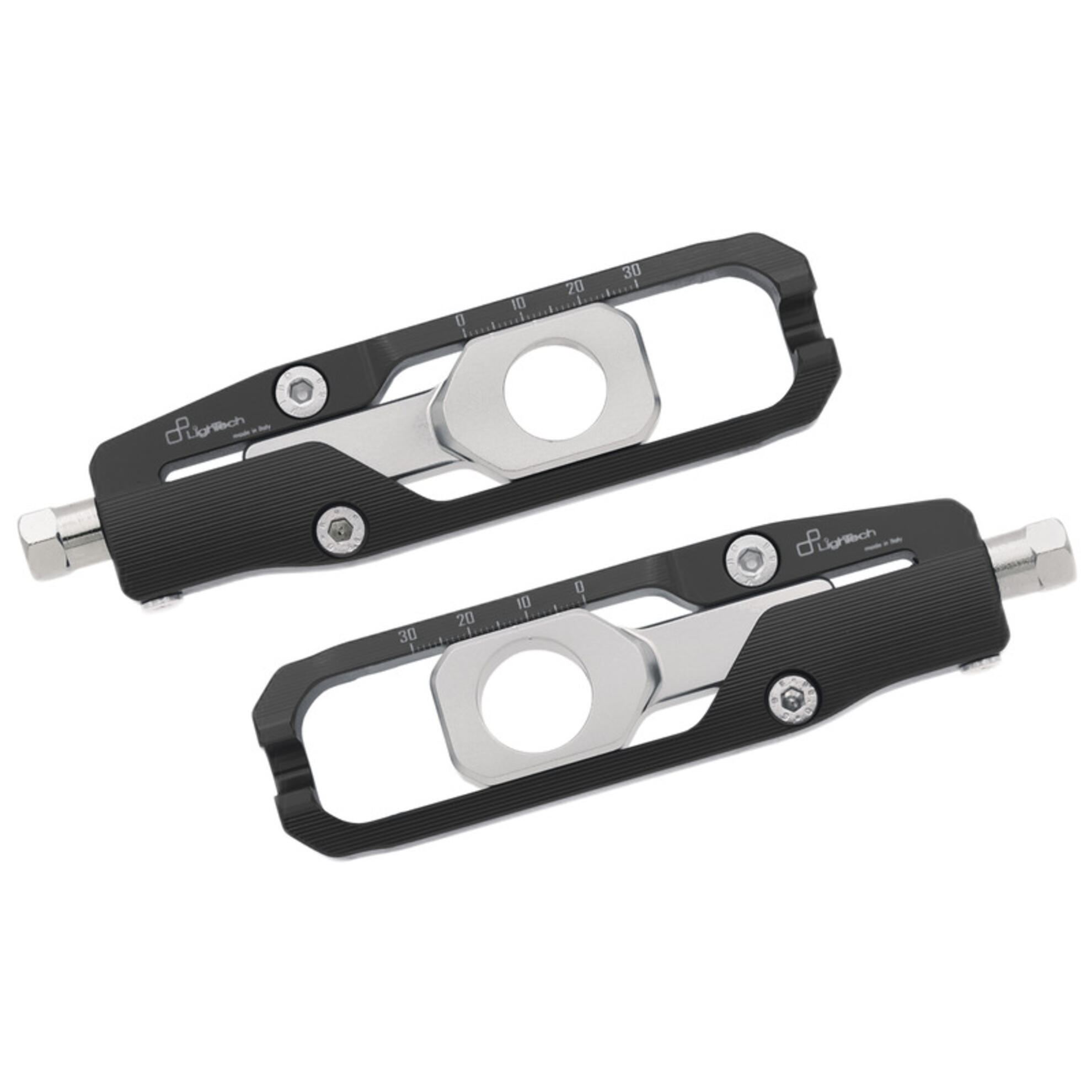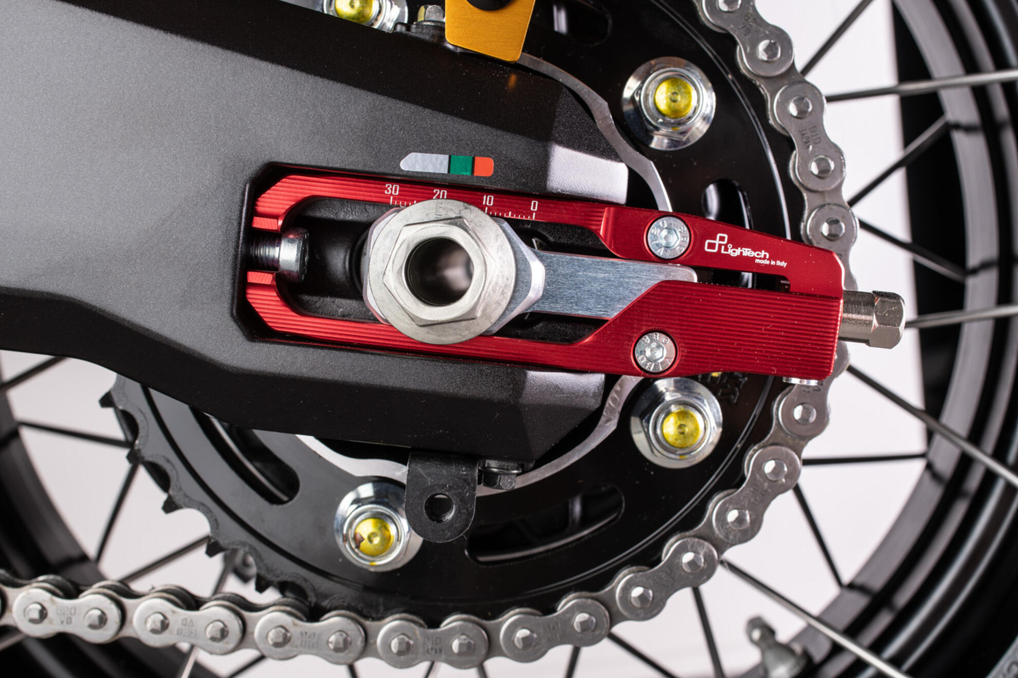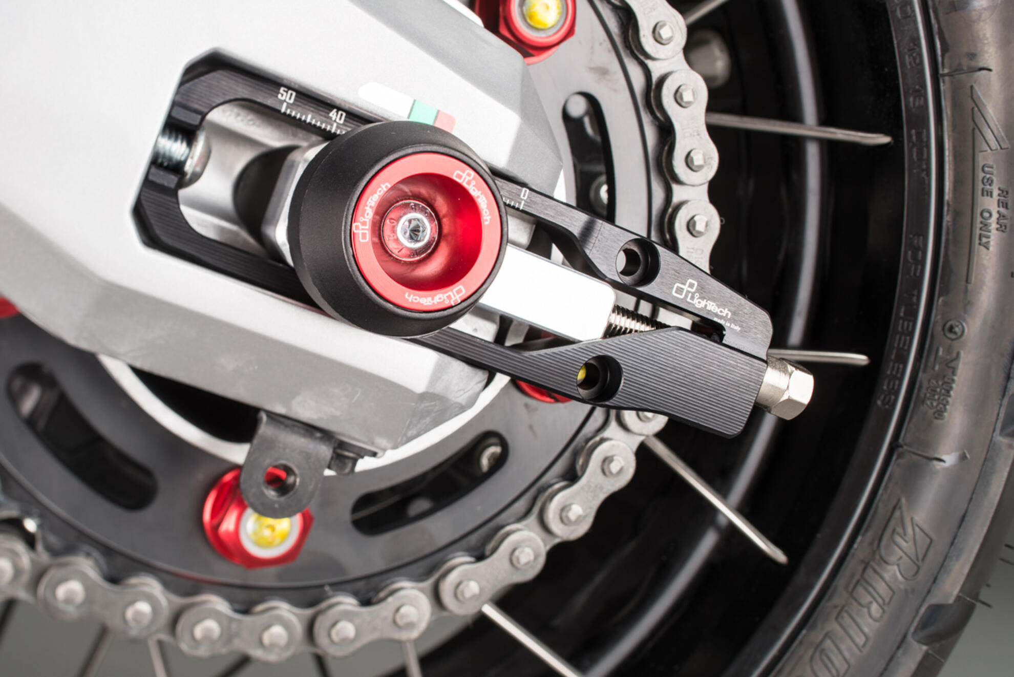 I nostri tendicatena sono realizzati in Ergal 7075 ricavati dal pieno, al fine di garantire una maggiore resistenza. Forniscono una regolazione della catena più accurata e facile rispetto ai tendicatena di serie. Presentano una regolazione esterna a vite per una messa a punto più veloce e precisa. Sul tendicatena è incisa una scala graduata a laser che ne facilita la regolazione.