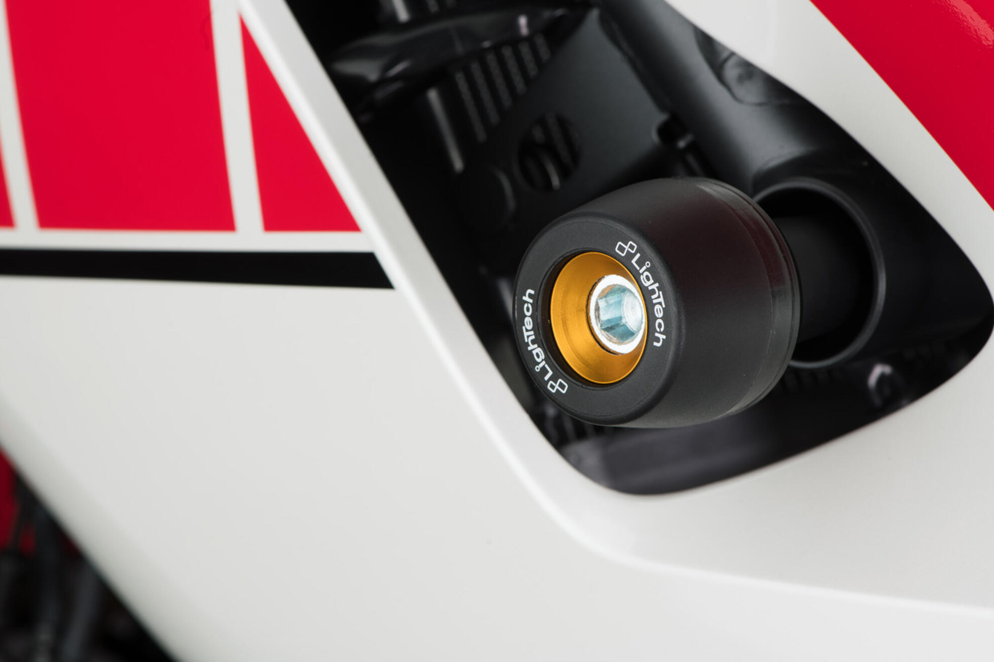 Le protezioni telaio LighTech nascono con lo scopo di proteggere la carena, il motore e altre parti della moto da eventuali urti o danneggiamenti. Ogni singolo componente è stato studiato e sviluppato per aumentare il fattore protezione, anche grazie ai particolari materiali utilizzati: l'anello superiore è prodotto in alluminio, materiale molto resistente ma, allo stesso tempo, molto leggero; la boccola di oscillazione è prodotta in magnesio, il guscio serigrafato con il logo Lightech marchiato a laser in nylon; il gommino shock- absorber in TPE durezza 60 Shore e il fondo in magnesio. Le protezioni telaio LighTech vengono fornite di tutto il necessario per il montaggio (perni e distanziali compresi). La configurazione standard viene fornita con anelli in alluminio NERO e gommini antishock NERO, ma è possibile personalizzare le protezioni telaio LighTech acquistando separatamente anelli e gommini di altri colori.