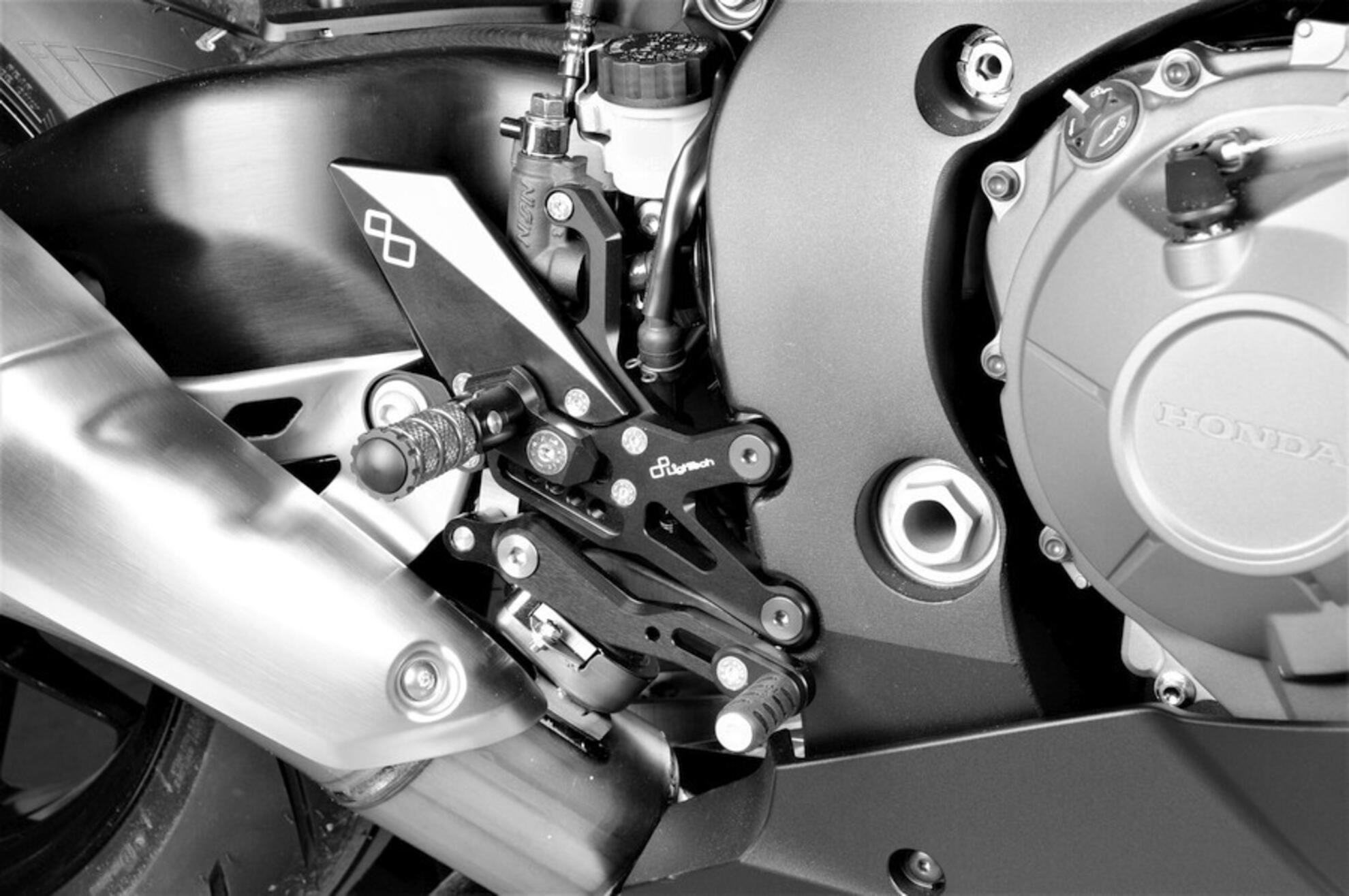 Lightech''s rearsets are made of Ergal 7075-T6 machined from solid. The main support is made of a single block, resulting in a more resistant structure and exceptional rigidity that transmits a greater driving feeling to the rider. They are adjustable in height and backwards, offering multiple footpeg positions, which can be implemented with the aid of optional footpeg holders. Up to 3 high-quality bearings are integrated into the levers to withstand the most extreme stresses on the road, but especially on the track. The rearsets can be customized thanks to a wide range of accessories and spare parts.