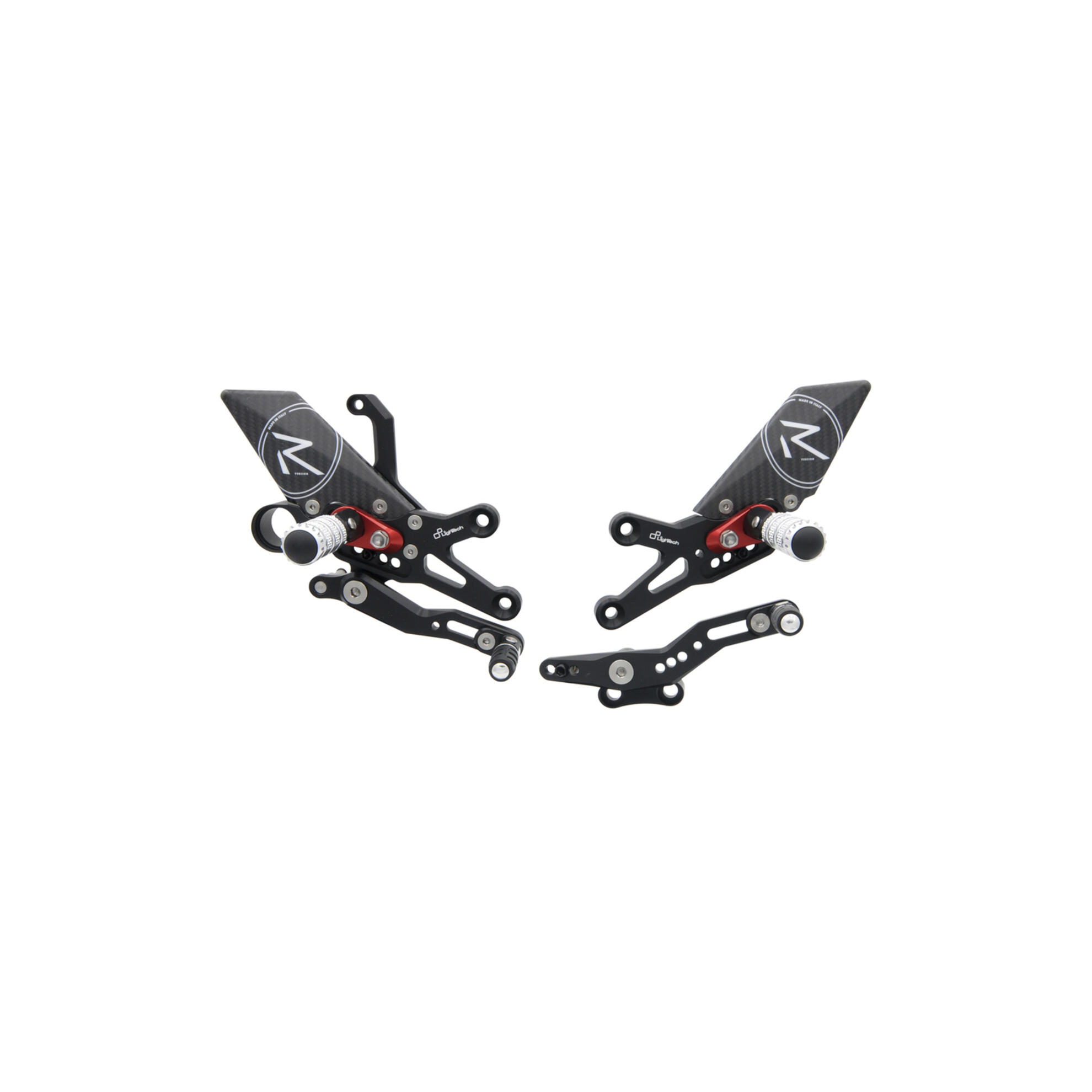 The ""R"" rearset is equipped with folding silver footpegs and toe-pegs, carbon heel guards, titanium bolts and red footpeg supports.
