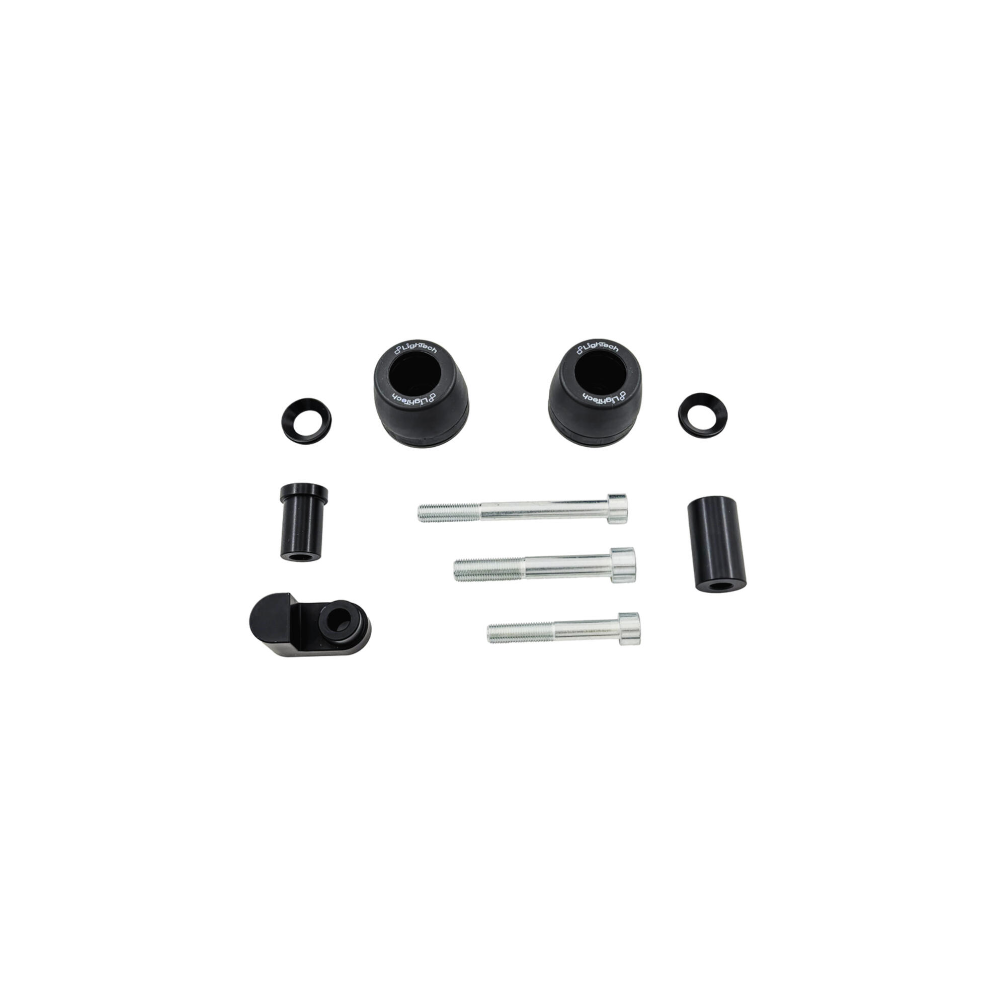 LighTech frame protectors were created with the aim of protecting the fairing, the engine and other parts of the motorbike from possible impacts or damage. Every single component has been studied and developed to increase the protection factor, also thanks to the particular materials used: the upper ring is produced in aluminium, a very resistant material but, at the same time, very light; the oscillation bush is made of magnesium, the shell silk-screened with the Lightech logo laser-branded in nylon; the shock-absorber rubber in TPE, hardness 60 Shore and the magnesium bottom. LighTech frame protectors are supplied with everything needed for assembly (including pins and spacers). The standard configuration is supplied with BLACK aluminum rings and BLACK anti-shock rubbers, but it is possible to customize the LighTech frame protectors by purchasing rings and rubbers in other colors separately.
